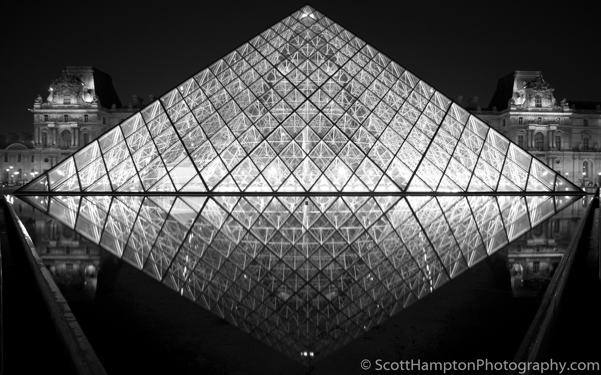 I remember the first time I visited the Louvre I resisted photographing the glass pyramids that were built in the courtyard of the Musée du Louvre (1984.) It seemed like sacrilege! Here is such a classic design and then they install a modern-looking structure right in the center of the courtyard. I use to think it was completely wrong. Well over the years I have decidedly changed my mind. Without question, this modern-looking glass pyramid enhances the Louvre‘s courtyard, especially in the evening. I also love the way the reflecting pools enhance the entire area. Guess that would be the purpose of a reflecting pool :-)
