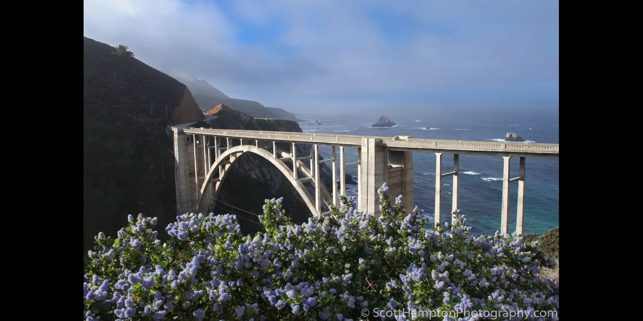 Bixby Bridge, is a reinforced concrete open-spandrel arch bridge in Big Sur, California. Bixby Bridge is the longest concrete arch span at 320 feet on the California State Highway System. It is one of the tallest single-span concrete bridges in the world and one of the most photographed bridges along the Pacific Coast. The Bixby Bridge is located 120 miles south of San Francisco (near Carmel) along State Hwy 1 (PCH.)