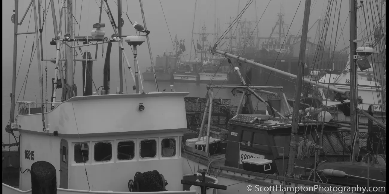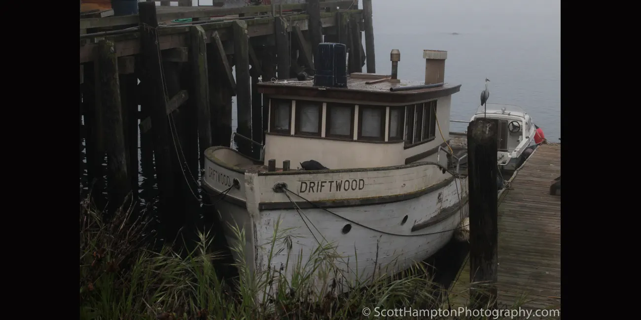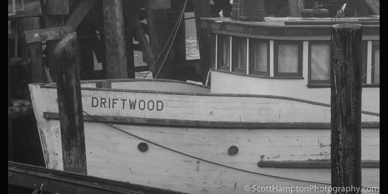Not sure how I got the name ''Driftwood’’ but it seems to work. I found this boat the wharf located in Morro Bay, California. It was a foggy morning which lends itself well to B & W photography. So I happen upon this classic wooden fishing boat which looked like it was ‘’built for the fog.’’ The town of Morro Bay was founded by Franklin Riley in 1870 as a port for the export of dairy and ranch products. He was instrumental in the building of a wharf which has now become the Embarcadero. During the 1870s, schooners could often be seen at the Embarcadero picking up wool, potatoes, barley, and dairy products. Since the beginning of the 20th century, the town has been a center for beach holidays. Tourism is the city's largest industry. The most popular beach is on the north side of Morro Rock, north of the harbor. There are also excellent beaches north and south of the town which are now owned by the State of California.