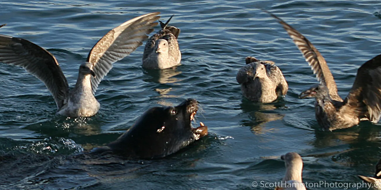 Some fishermen were dropping chum into the water and apparently this seal felt like it needed to protect ''his or her food.'' It was quite entertaining to watch this seal bark at all the Seagulls.