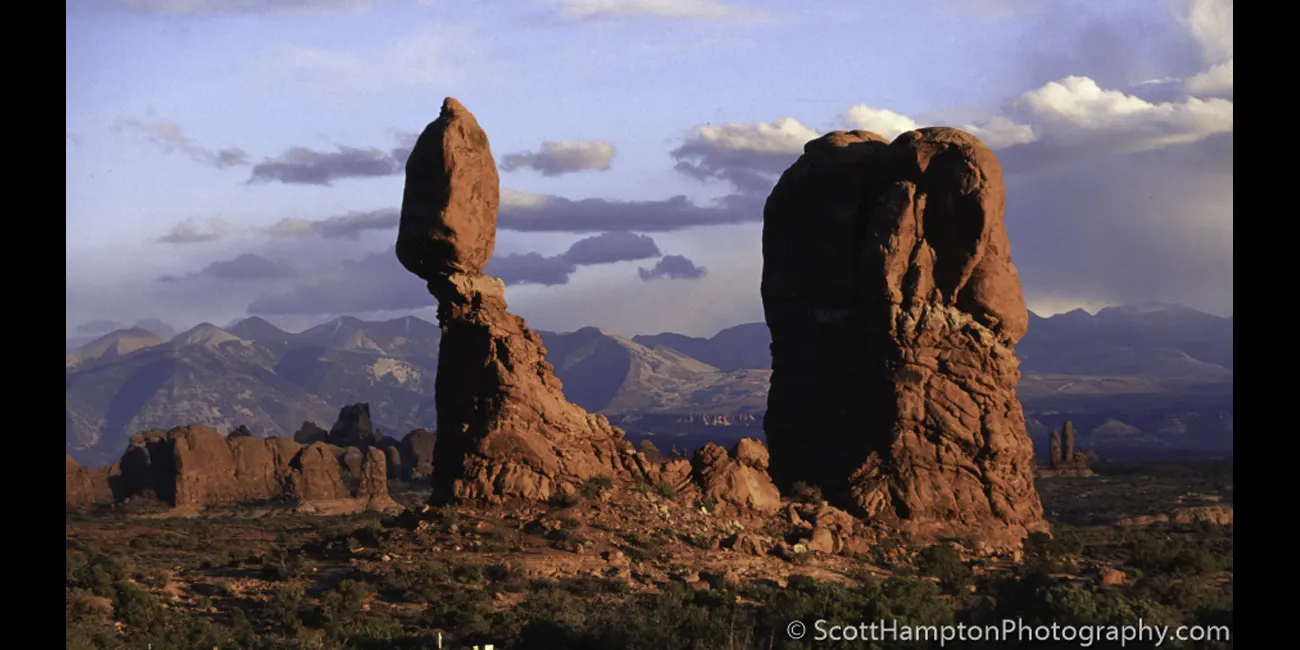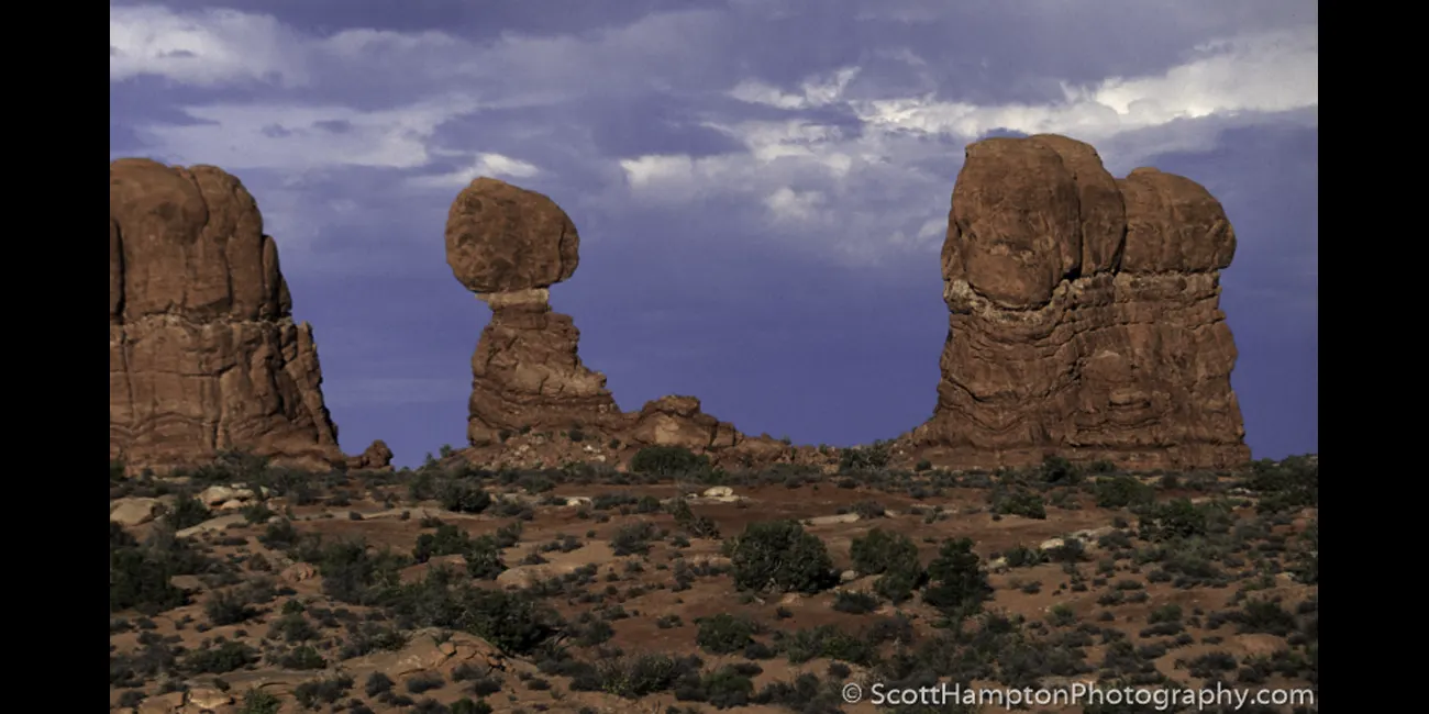 Balanced Rock at Arches National Park taken from a not so dramatic vantage point, however the skies were quite dramatic.