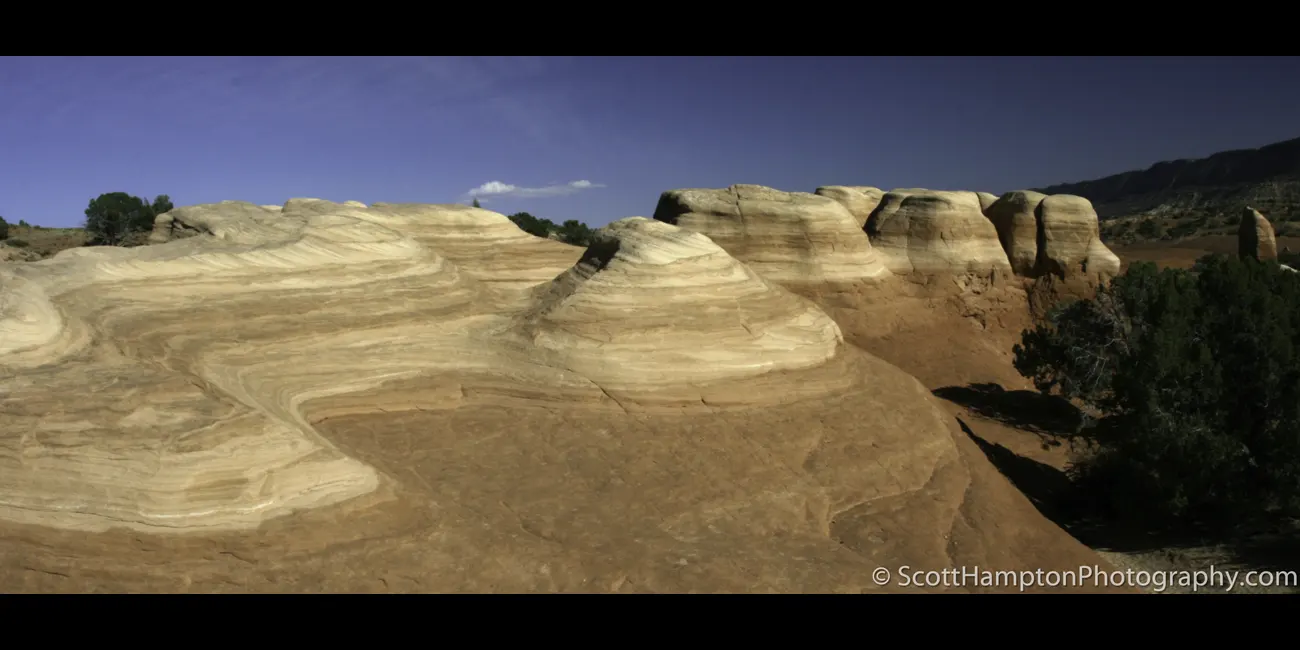 This is one of the very few photos I have posted on my website that was originally shot with black and white film. I also shot this using a digital color camera but when I converted it to black and white, I lost the texture on the rocky hill. This is because film has a lot less latitude and therefore the shadowy areas are more “pronounced.” In this case the shadows showcase the many layers of sandstone that created this hill.