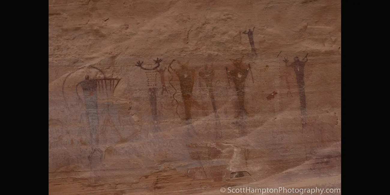 Primarily a Barrier Canyon Style panel, there are a few later petroglyphs of Fremont culture origin as well. In many cases the Fremont painted figures on top of the older Barrier Canyon ones.