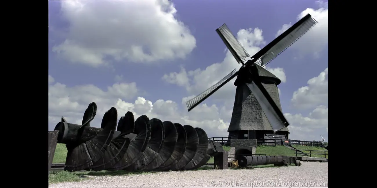 Historically, windmills in Holland served many purposes. The most important probably was pumping water out of the lowlands and back into the rivers beyond the dikes so that the land could be farmed. In the fourteenth century, hollow-post mills were used to drive scoop wheels to drain the wetlands.