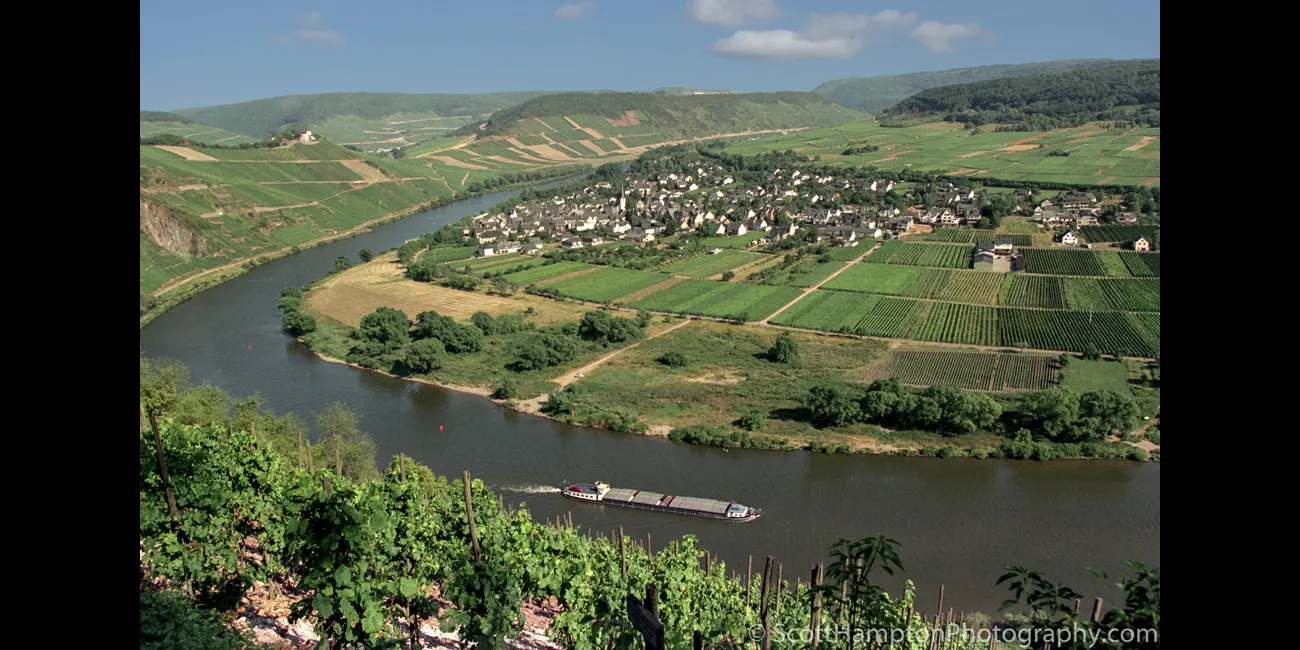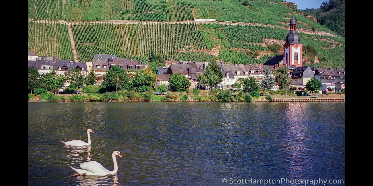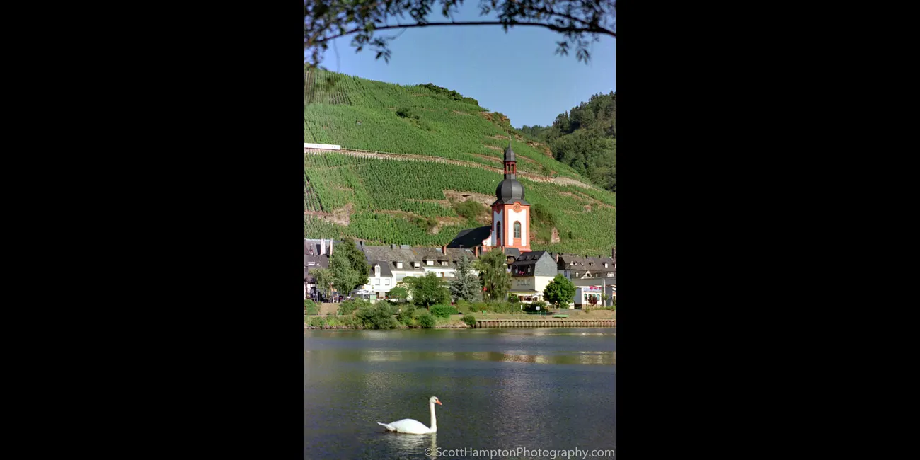 A couple beautiful swans paddling up the Mosel River. Across the River lies a small village called Zell and the chapel you see is called Saint Peter’s and Saint Paul’s Catholic Church which was built between 1786-1792.