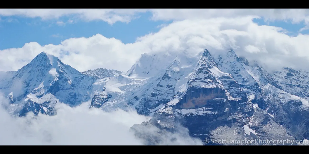 The Jungfrau (13,642 ft) is one of the main summits of the Bernese Alps. Together with the Eiger and Mönch (on the right), the Jungfrau forms a massive wall of mountains overlooking the Bernese Oberland and the Swiss Plateau, one of the most distinctive sights of the Swiss Alps.