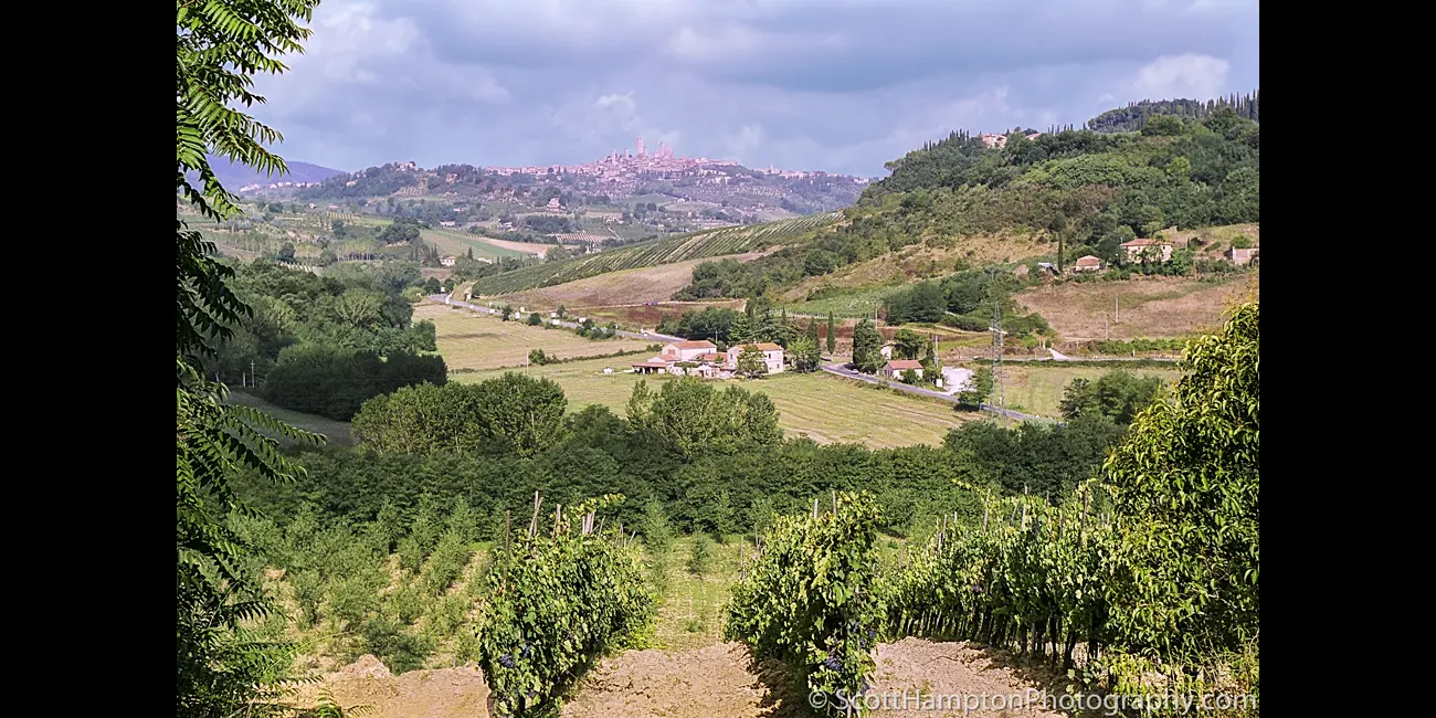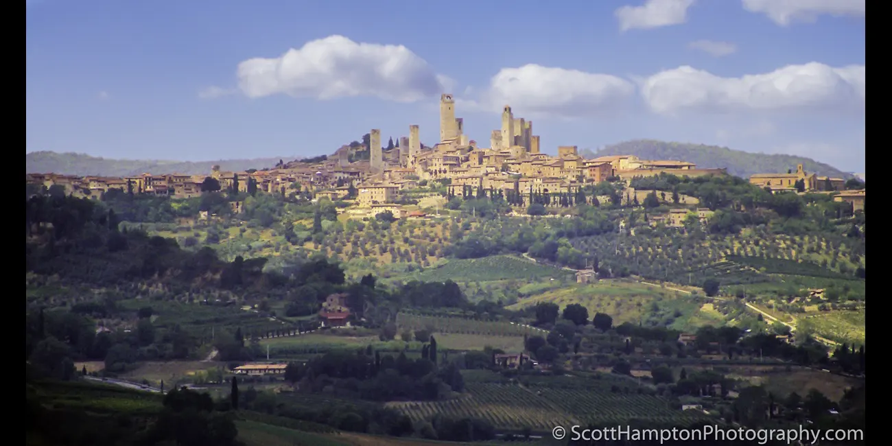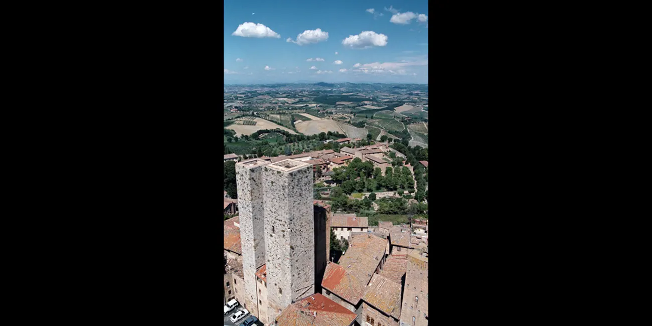 San Gimignano is a small walled medieval hill town in the province of Siena, Tuscany, north-central Italy. Known as the Town of Fine Towers, San Gimignano is famous for its medieval architecture, unique in the preservation of about a dozen of its tower houses, which, with its hilltop setting and encircling walls, form "an unforgettable skyline". Within the walls, the well-preserved buildings include notable examples of both Romanesque and Gothic architecture, with outstanding examples of secular buildings as well as churches.